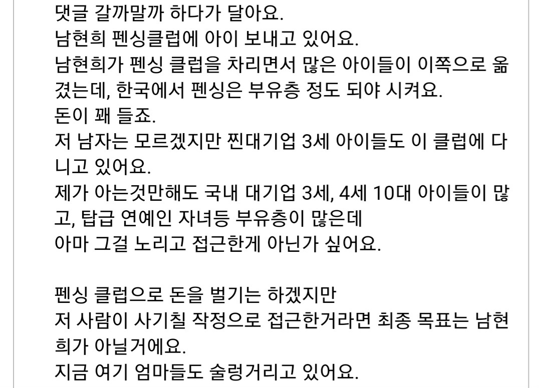 전청조 고딩 때 사진 말을 만져보긴 했어... 남현희 펜싱클럽 학부모 학부모 댓글 바로보기 출처 : https://theqoo.net/square/2976098545