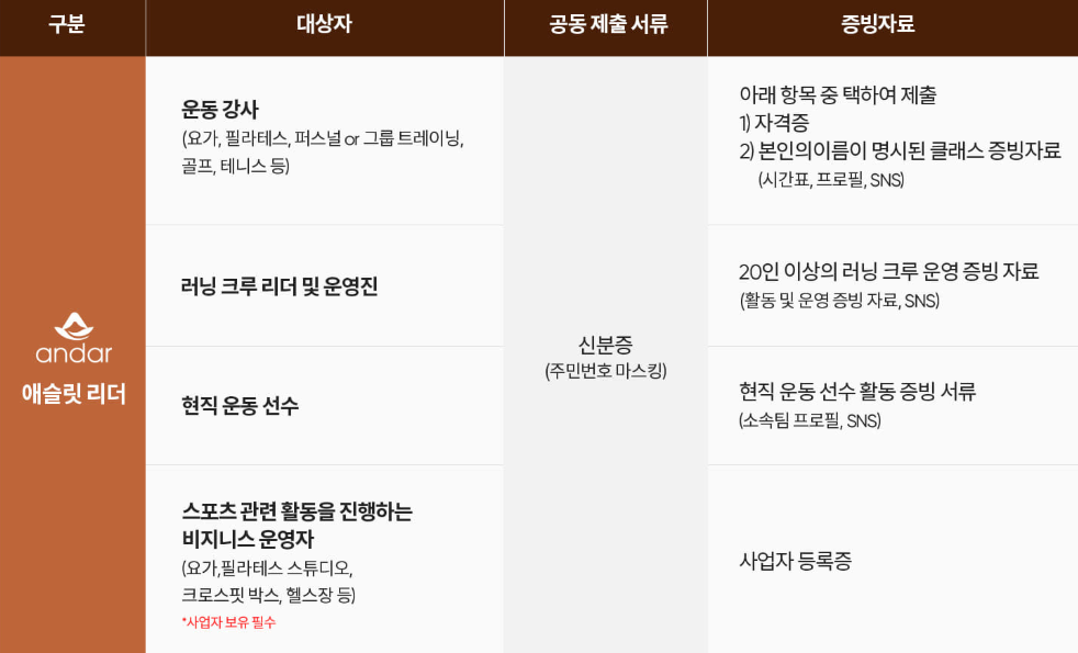 - 안다르 / 젝시믹스 / 뮬라웨어: 필라테스·요가·PT 자격증 보유 시 최대 30~40% 할인