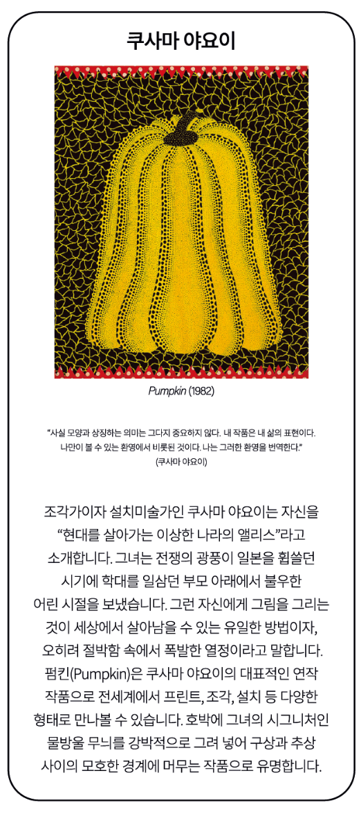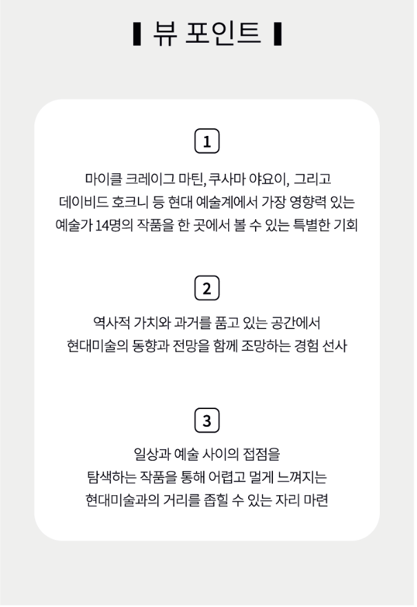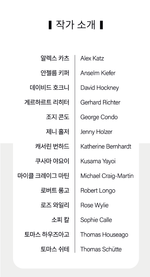 오랜만에 대전에서 멋진 전시가 시작되었습니다. 블로그에 홍보 글을 올리니 근처 사시는 분들은 꼭 방문해보세요. 참여하는 작가들의 이름이 정말 대단한 전시입니다. 쿠사마 야요이부터 데이비드 호크니까지! 저는 꼭 보고싶었던 안젤름 키퍼의 이름을 리스트에서 보고 전율이 흘렀습니다! 저는 서울 수도권에 거주하지만, 이 멋진 작가들의 작품을 한번에 볼 수 있어 대전까지 방문할 계획입니다. 미리 사이트에서 예약하여 방문하시길 바래요